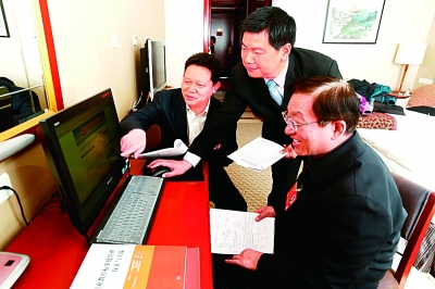 3月1日,全國政協(xié)委員楊興平(左)、楊學(xué)義(右)、蘇華(中)在駐地賓館就相關(guān)提案進(jìn)行交流。