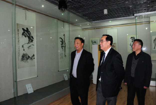 鄔旦生(左)在四川現(xiàn)代教育集團理事李志強(中)和德陽外國語學(xué)校校長何軍(右)的陪同下參觀位于德陽外國語學(xué)校的德陽現(xiàn)代美術(shù)館