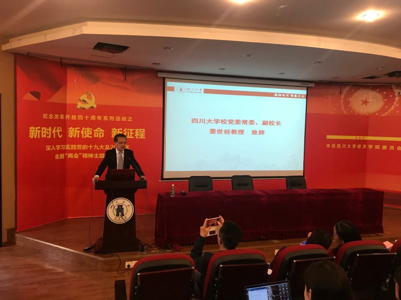德陽市千山街三段87號4月10日下午,由四川大學(xué)經(jīng)濟(jì)學(xué)院主辦的“新時代 新使命 新征程”深入學(xué)習(xí)貫徹十九大及2018年全國“兩會”精神校友主題論壇在經(jīng)濟(jì)學(xué)院西202學(xué)術(shù)報告廳舉行。