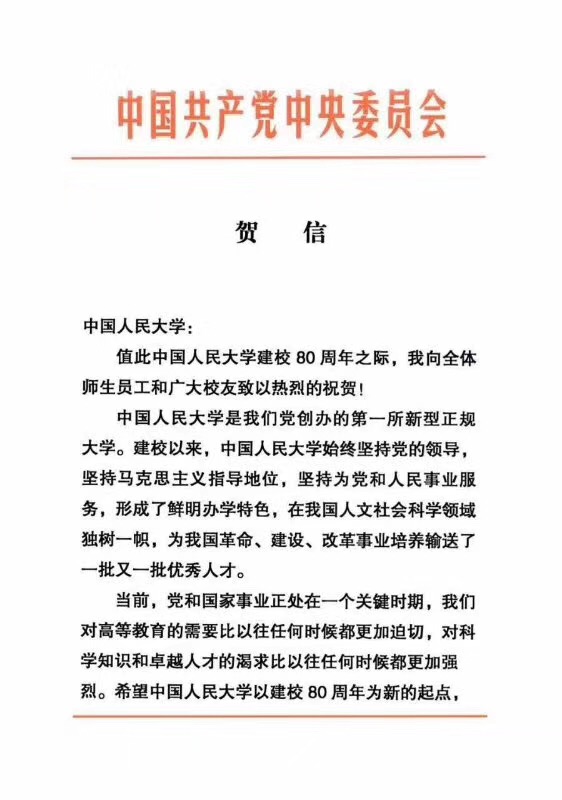習(xí)近平總書記向中國(guó)人民大學(xué)建校80周年發(fā)來(lái)賀信